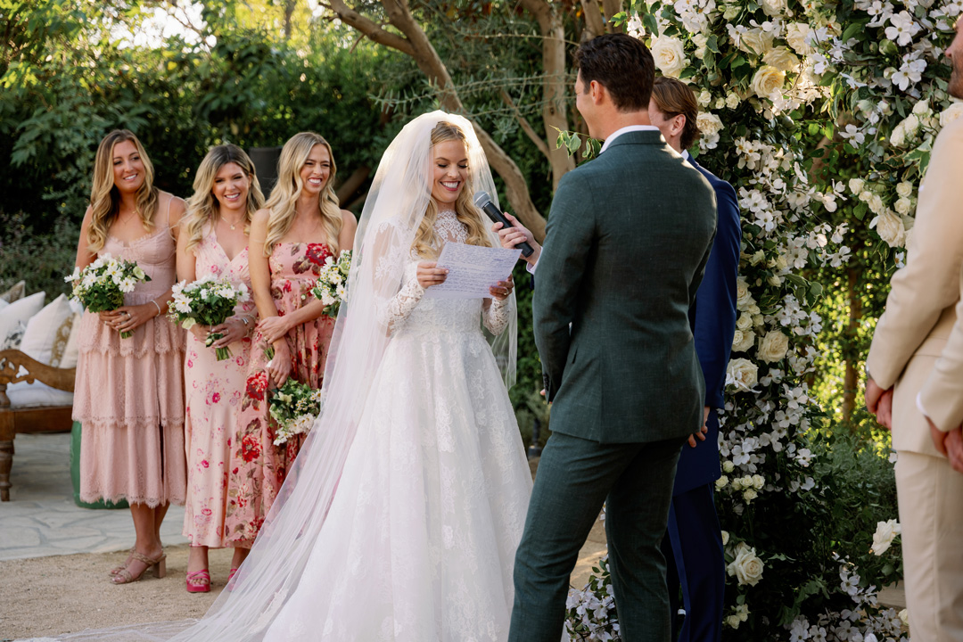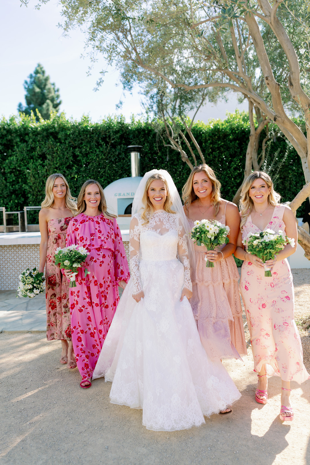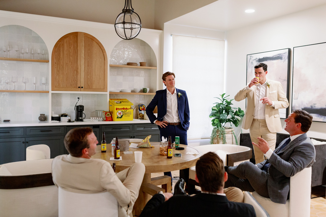 Claire and her bridal party popped champagne and got ready inside the Powder Room at Grand Gimeno while Nick and his groomsmen suited up inside the Parlor. Hair and makeup ready, the girls stepped out into the Olive Grove for group photos. The bridesmaids were dressed in different pink dresses and Claire of course wore white. Fresh floral bouquets were in tow as the girls wandered around the outdoor space smiling for the camera. Meanwhile, Nick and his groomsmen gathered in the Courtyard for photos. The groomsmen were dressed in beige and Nick wore a forest green suit. Once all the group pictures were done, the wedding party headed back inside to line up for the ceremony.