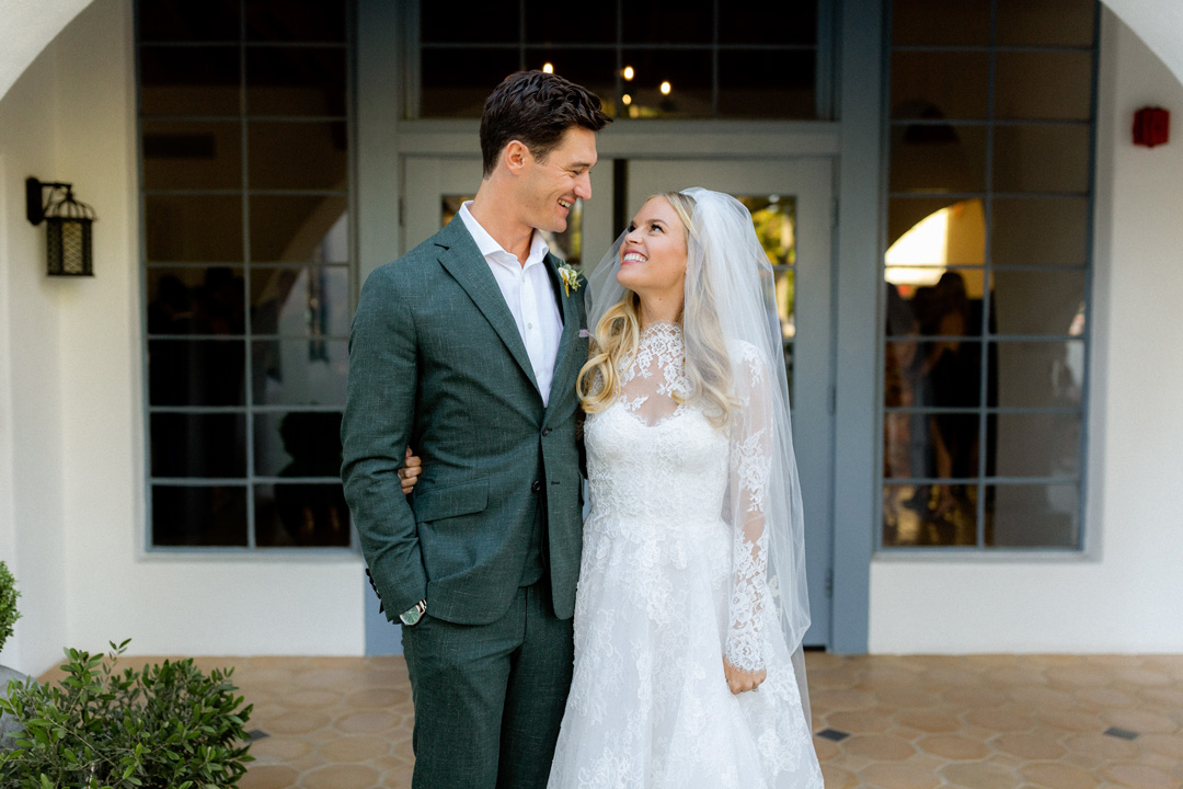 Friends and family entered the Olive Grove and mingled until it was go-time. The lush landscaping surrounding the ceremony space tied in perfectly with the greenery and white floral ceremony arbor at the head of the aisle. Once everyone was seated, the wedding party made their entrances ending with Claire. Nick did his best to keep it together when he saw his beautiful bride for the first time coming down the aisle towards him, and once joined together, both him and Claire were all smiles. In font of all their guests, Claire and Nick read personalized vows, exchanged rings, and sealed the ceremony with a kiss. The crowd cheered and the newlyweds made their exit into cocktail hour.