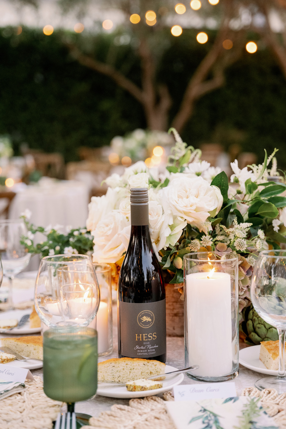 Back in the Olive Grove, tables were decorated with fresh floral centerpieces, rattan charger plates, flickering candles, green goblets, and decorative linens. Guests checked the orange crate seating chart display to find their assigned tables and made their way into reception. Once every chair was filled, Nick and Claire made their grand entrance, shared their first dance, then took a seat at their head table. Next, dinner began with Tangerine Pecan Salad. While everyone enjoyed the salad course, friends and family stood to share toasts. Glasses clinked in the air and the final entrée course was served which included Cabernet Braised Short Ribs and Lemon and Thyme Chicken with Grilled Green and White Asparagus and Gourmet Mashed Potatoes. The menu was selected by the bride and groom with help from our Event Specialist, Sierra, during their planning process. The newlyweds thanked everyone for coming to celebrate their love story and invited everyone to indulge in our Italian Dessert Station with a collection of Fresh Fruit Tarts, Chocolate Dipped Cannoli, Florentine Cookies, Meyer Lemon Cheesecake Bars, and Mini Italiano Tiramisu Cupcakes and hit the dance floor. The live band played song after song that coaxed every guest out of their chair. The evening ended with hundreds of glow sticks up in the air while everyone danced their hearts out.