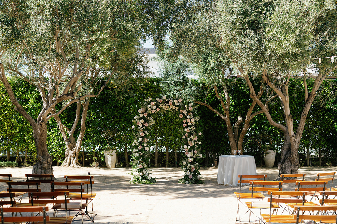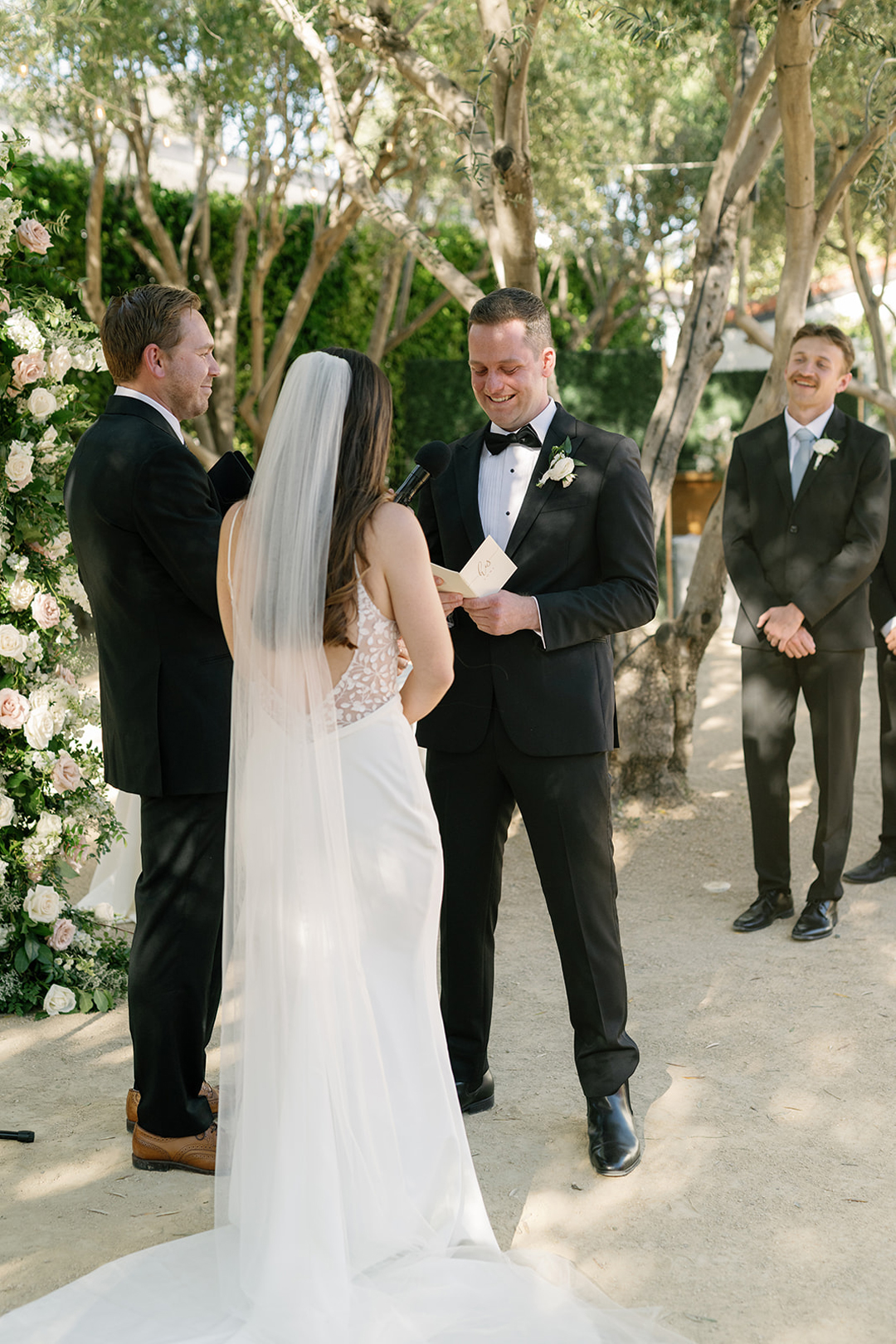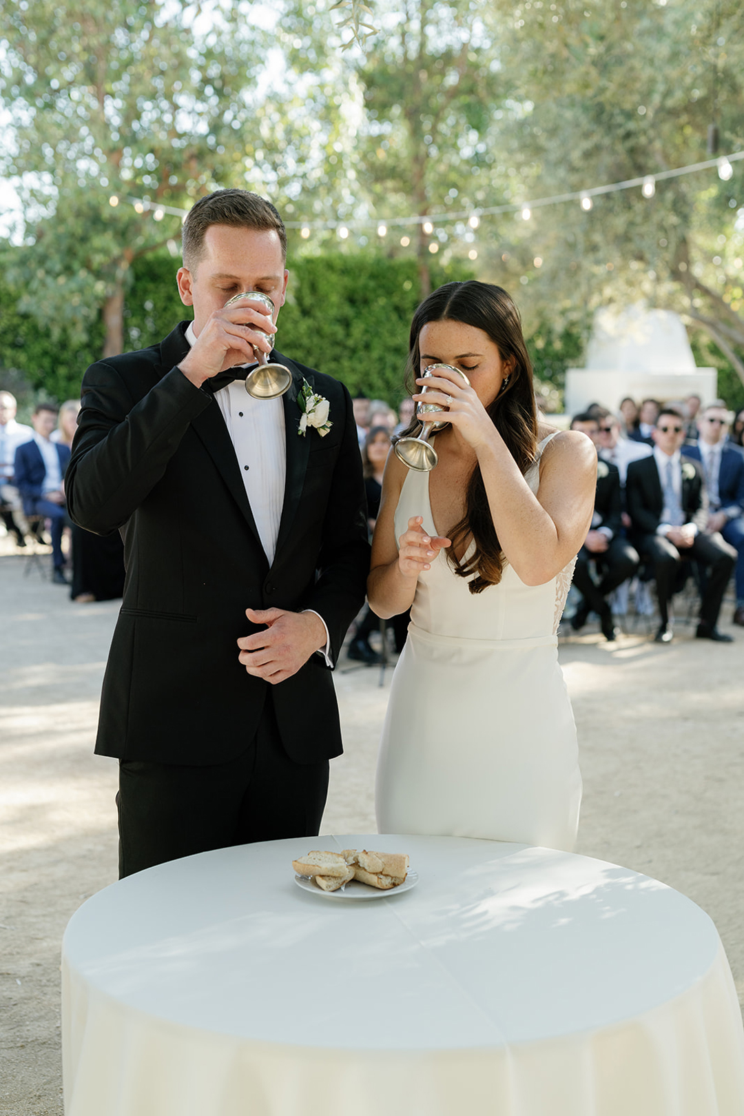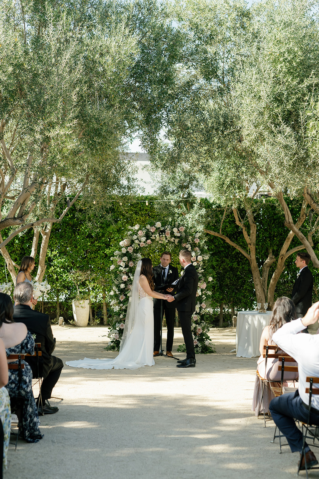 Cassie and her bridesmaids and Michael and his groomsmen got ready inside the Powder Room and Parlor at Grand Gimeno, then lined up for the ceremony as guests began arriving at the venue. White and blush pink roses decorated the ceremony arch that stood tall under the Olive Grove trees. Once everyone had taken a seat, the music cued up and the wedding party made their entrances ending with Cassie. Happy tears filled Cassie and Michael’s eyes when they saw each other for the first time that day. Joined together at the headed of the aisle, the couple recited their vows, broke bread, exchanged rings, and sealed the ceremony with a kiss.