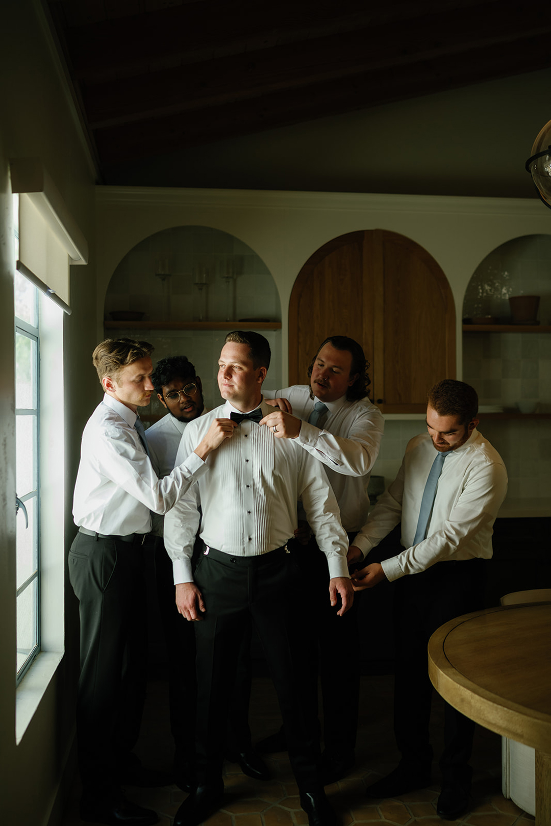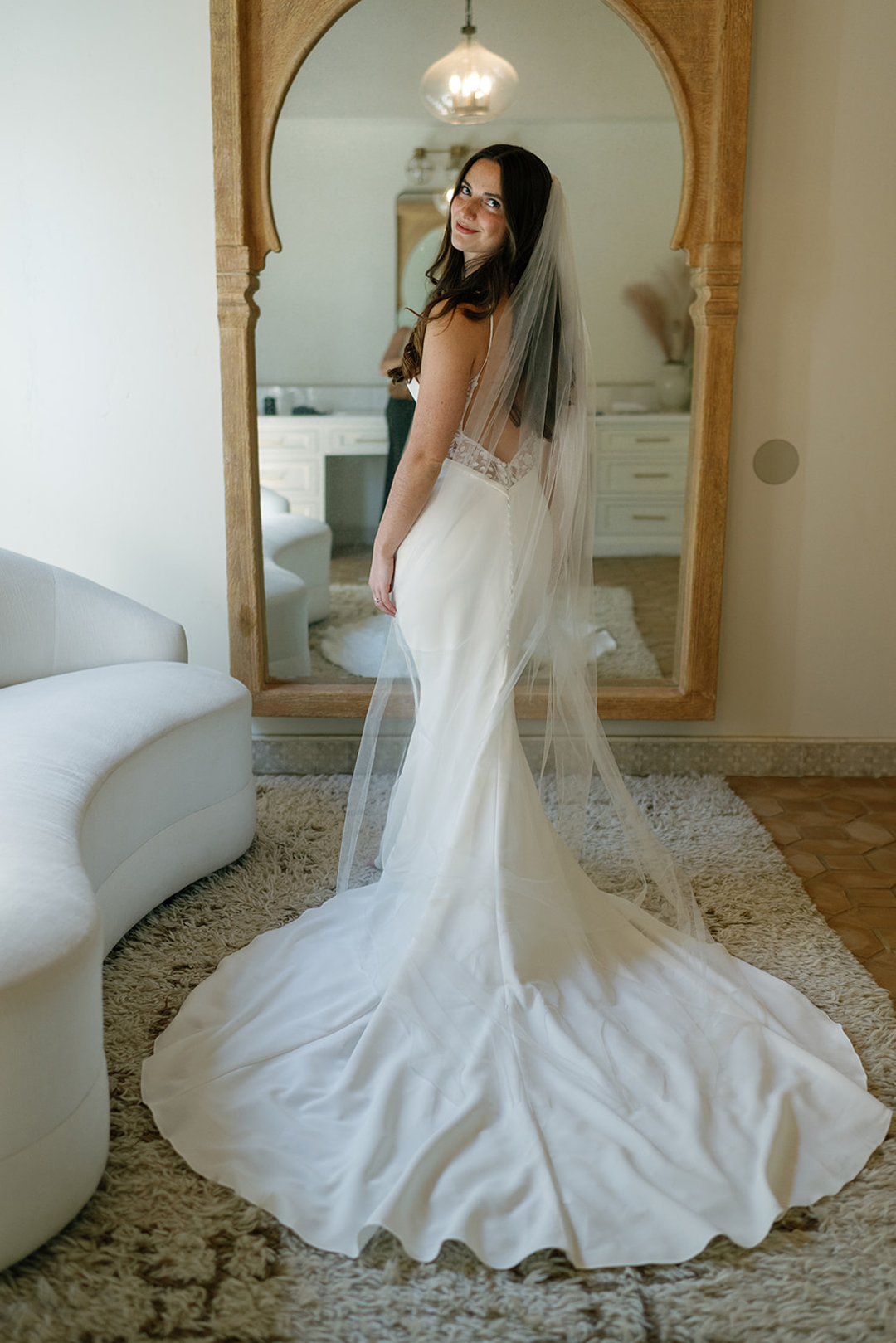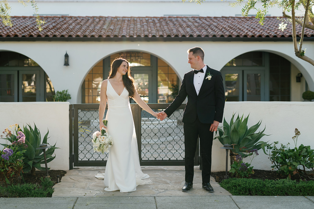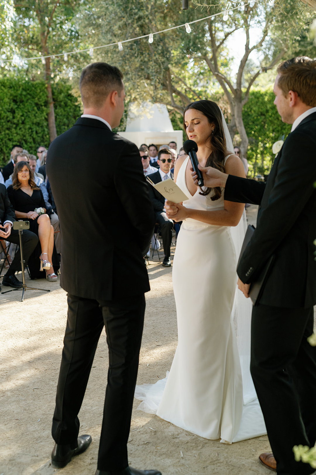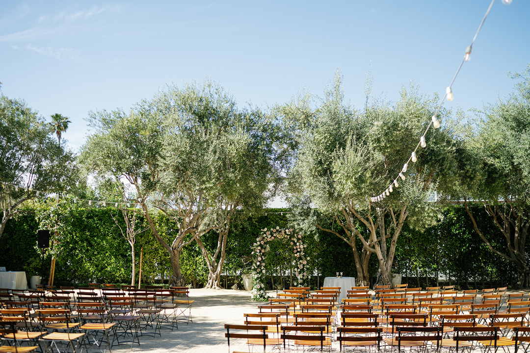 Cassie and her bridesmaids and Michael and his groomsmen got ready inside the Powder Room and Parlor at Grand Gimeno, then lined up for the ceremony as guests began arriving at the venue. White and blush pink roses decorated the ceremony arch that stood tall under the Olive Grove trees. Once everyone had taken a seat, the music cued up and the wedding party made their entrances ending with Cassie. Happy tears filled Cassie and Michael’s eyes when they saw each other for the first time that day. Joined together at the headed of the aisle, the couple recited their vows, broke bread, exchanged rings, and sealed the ceremony with a kiss.