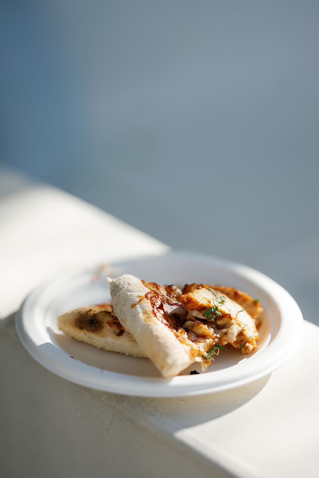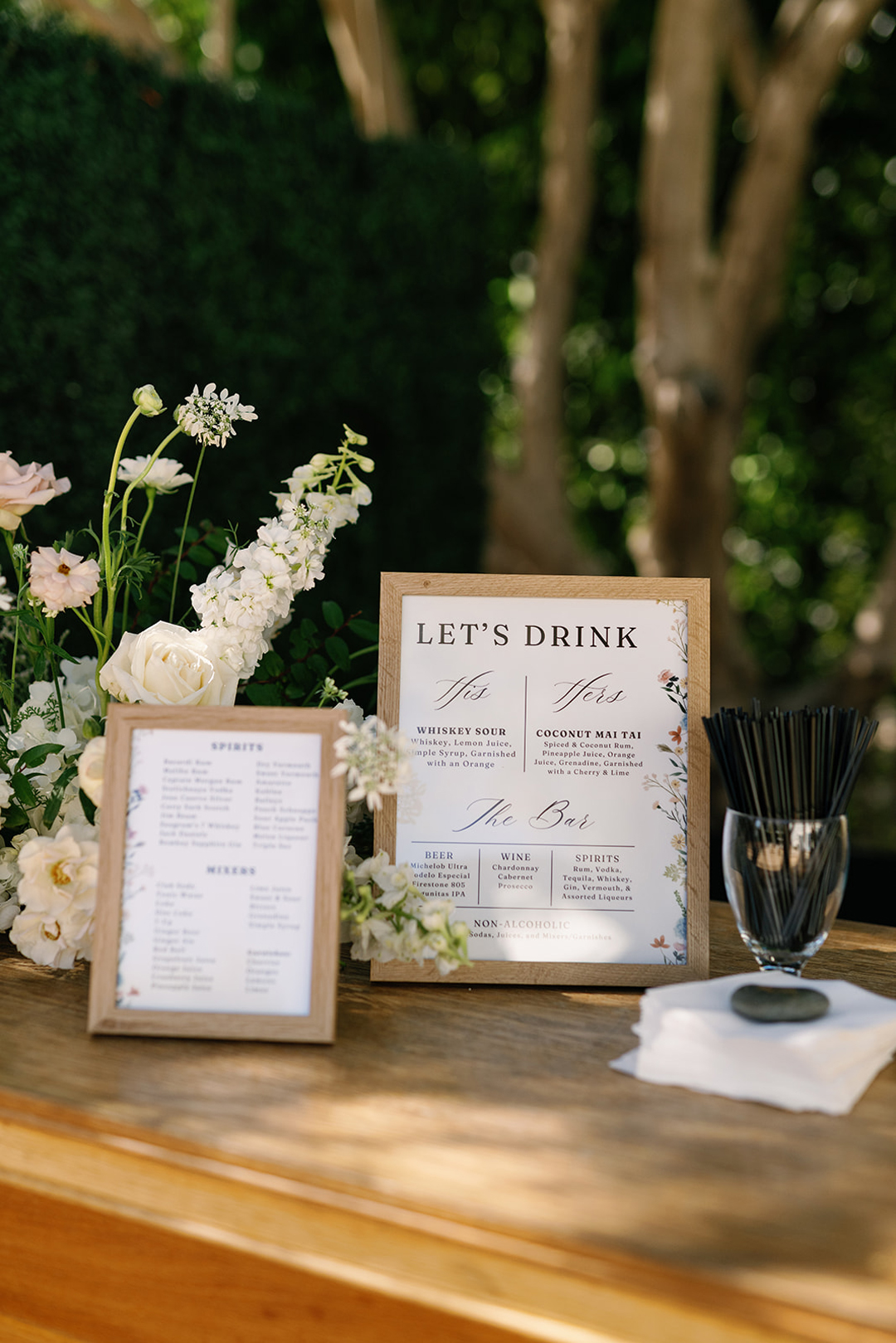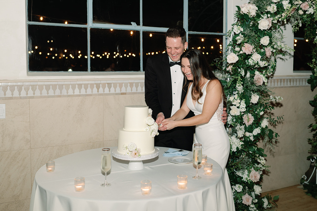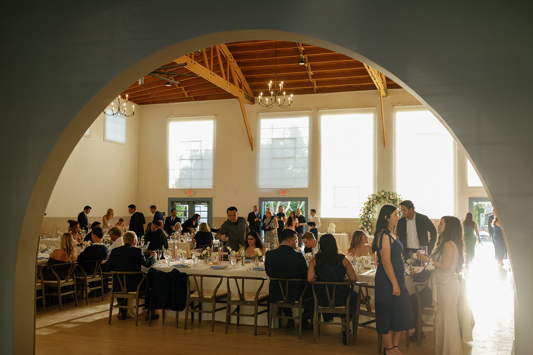 Filet and Wild Mushroom Wellingtons and Crab Cakes made their rounds while Wood-Fired Neapolitan and Classic BBQ Chicken Pizzas were cut and served fresh. Bartenders served signature Whiskey Sour and Coconut Mai Tai cocktails at the bar and a Cheese Tray and Fruit Tray were also available to snack on. Guests mixed and mingled while the newlyweds snuck away for golden hour photos, and upon their return it was time to head inside for the reception.