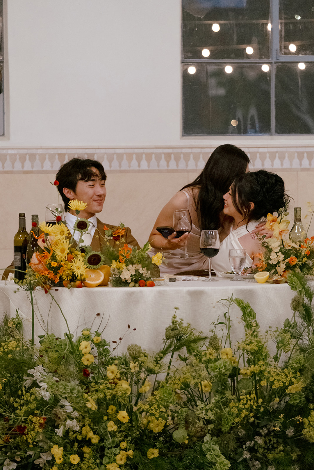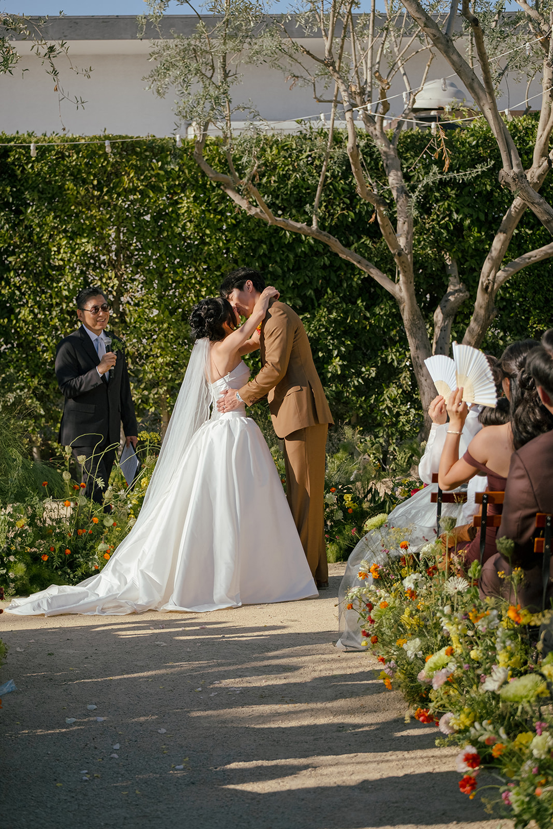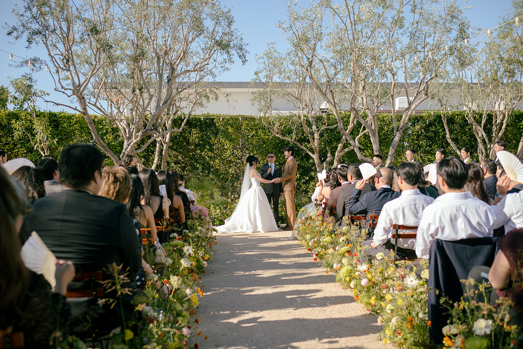 Guests entered the Olive Grove, signed Troy and Alice’s guest book, then took a seat. Vibrant orange, yellow, and green florals and foliage lined the aisle and decorated the space under the olive trees where Alice and Troy would soon stand. Once everyone was in attendance, the music cued up and the wedding party made their entrances. In front of all their closest friends and family, Troy and Alice recited their vows, exchanged rings, and sealed the ceremony with a kiss as guests cheered from their seats.