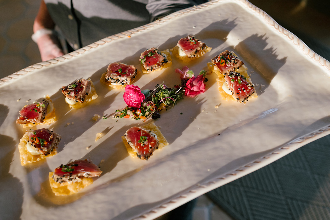 Wood-Fired Neapolitan and Classic BBQ Chicken Pizzas were cut and served fresh while Seared Ahi on Wonton Chip and Braised Pork Belly Bao were tray passed around the Olive Grove. Everyone mixed and mingled and posed for photos with the newlyweds, then headed inside for the reception.