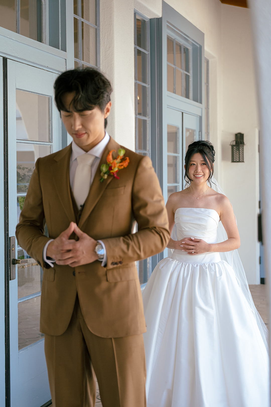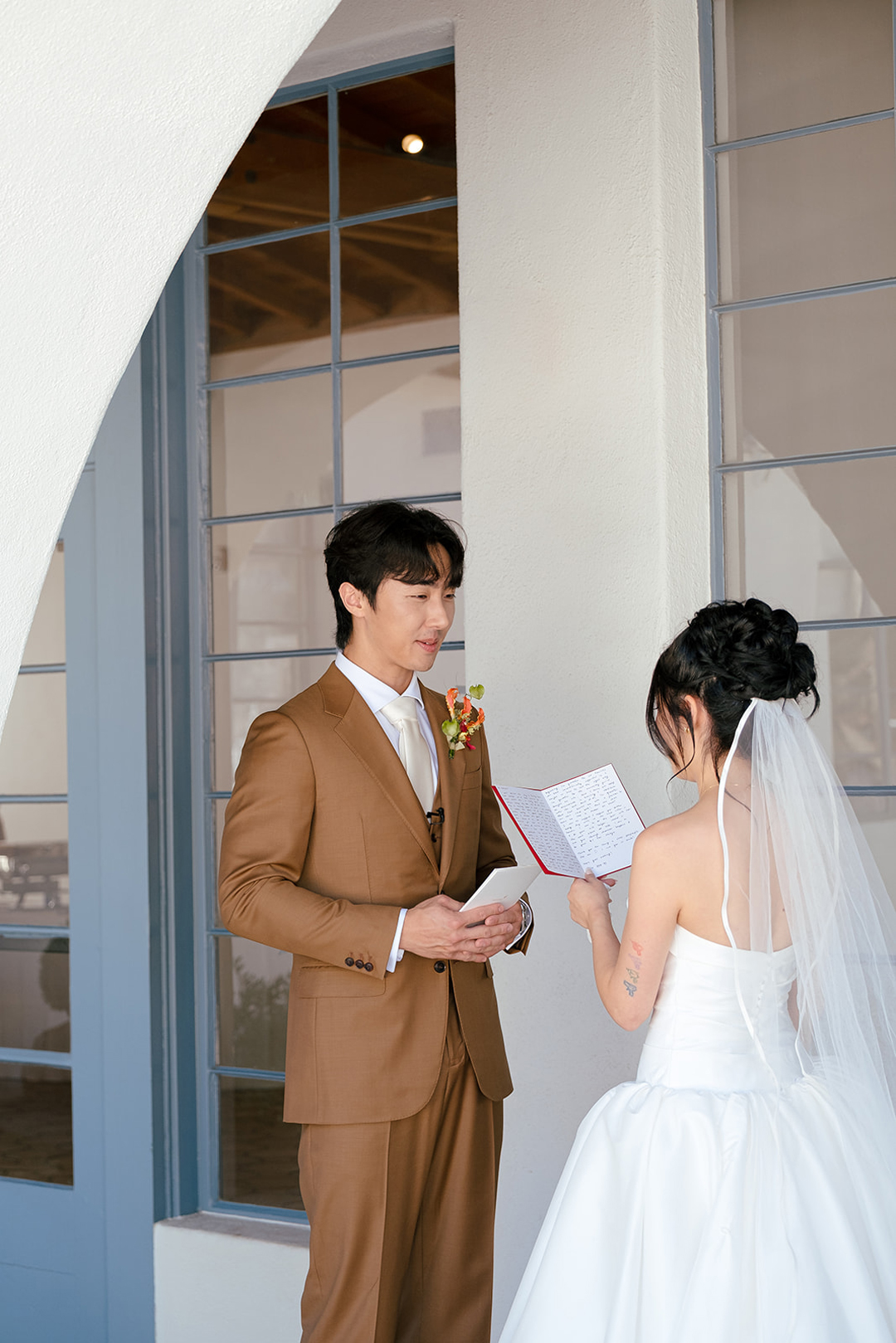 Alice and Troy met in the Courtyard at Grand Gimeno for their first look on the afternoon of their wedding. A tap on the shoulder turned Troy around to see his beautiful bride standing before him dressed in white. Sweet compliments were exchanged and private vows were read during the intimate moment between the couple. Afterwards, the bride and groom lined up for their wedding ceremony with their wedding party.