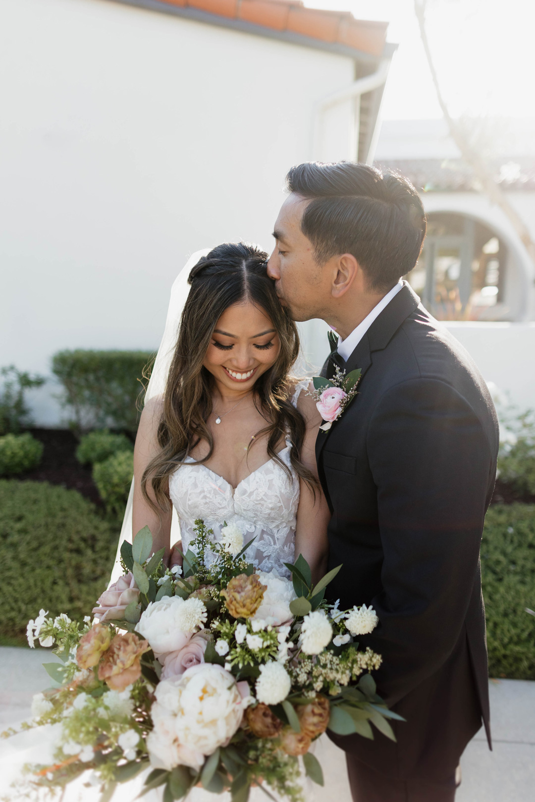 Guests entered the Olive Grove, signed the bride and groom’s guest book, then took a seat. Fresh floral arrangements marked the sides of the aisle and where the bride and groom would soon exchange vows. Once everyone had arrived, the music cued up and the wedding party made their entrances. In front of all their closest friends and loving family, Michelle and Johnny recited vows, exchanged rings, and sealed the ceremony with a kiss.