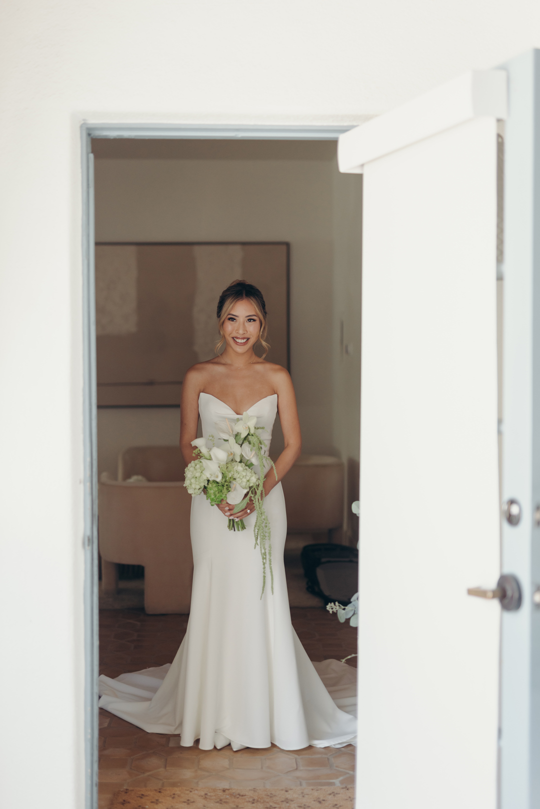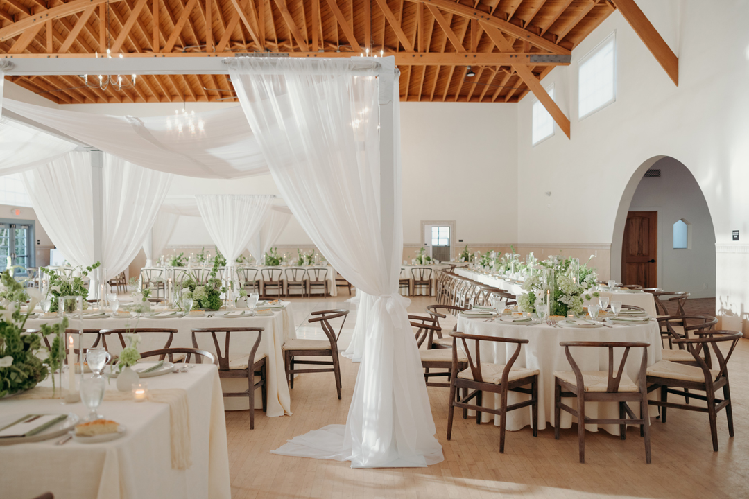 Guests entered the Olive Grove, signed the bride and groom’s guest book, then took a seat. A modern ground arrangement of green and white hydrangeas was placed as the ceremony backdrop and matching arrangements marked the back of the aisle. Once all the guests were in attendance, the music cued up, and the wedding party made their entrances ending with Stephanie. In front of all their friends and family, Stephanie and Shawn read handwritten vows, exchanged rings, and sealed the ceremony with a kiss.