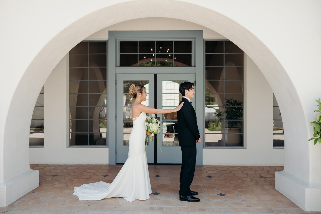 Stephanie got ready in the Grand Gimeno Powder Room with her bridesmaids while Shawn suited up in the Parlor with his groomsmen. Once the bride and groom were ready, they stepped out into the Courtyard for their first look. A tap on the shoulder turned Shawn around to see his beautiful bride standing before him in a strapless wedding dress. Big smiles filled their faces, and sweet compliments were exchanged while the wedding party watched from the sidelines. After a few photos of the couple, their bridesmaids and groomsmen joined in for group pictures, then they all lined up together for the ceremony.
