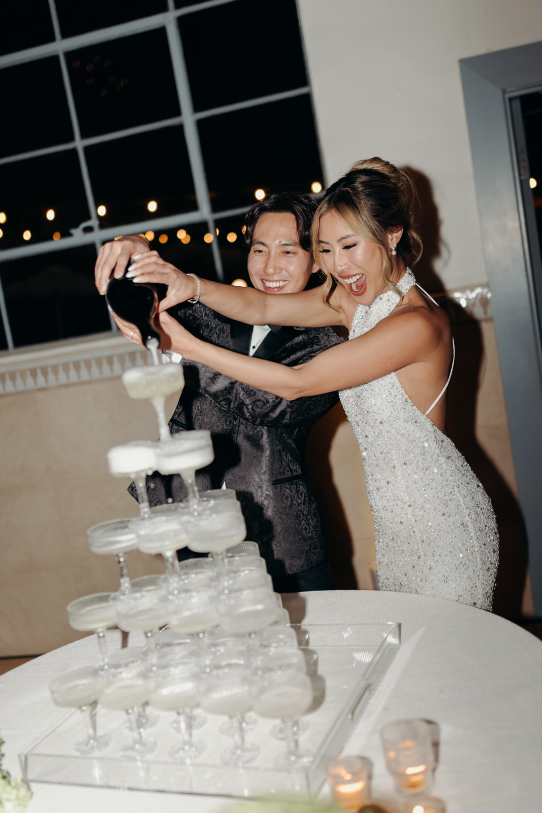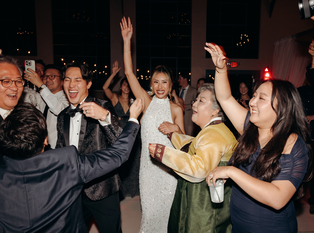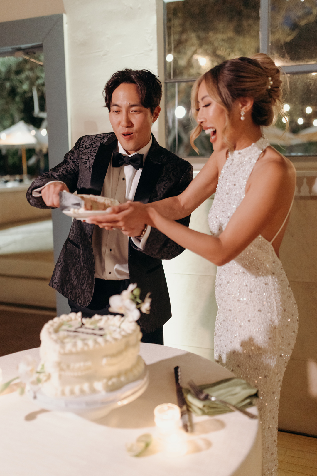 White draped canopies were stationed around tables topped with green and white floral arrangements. Shawn and Stephanie made their grand entrance, shared their first dance, then took a seat at their sweetheart table. Pear and Walnut Salad was served followed by plated Classic Filet Mignon and Roasted Atlantic Salmon Fillet with Haricot Verts and Gourmet Mashed Potatoes while guests shared toasts. After dinner the newlyweds cut into our Vintage Heart Cake and invited everyone to indulge in our Taste of Asia Dessert Station with a collection of Yuzu-Mango Tarts, Ube Crinkle Cookies, Pandan Cupcakes, Café Sua da Macarons, and Golden Milk Flan with Chai Whipped Cream. After a sweet treat, everyone hit the dance floor. Dances were shared, selfies were taken, and a late night snack of Mini Corn Dogs and Cuban Papas Rellenas were highly appreciated by guests. Well wishes were shared and Stephanie and Shawn were sent off with love of love.