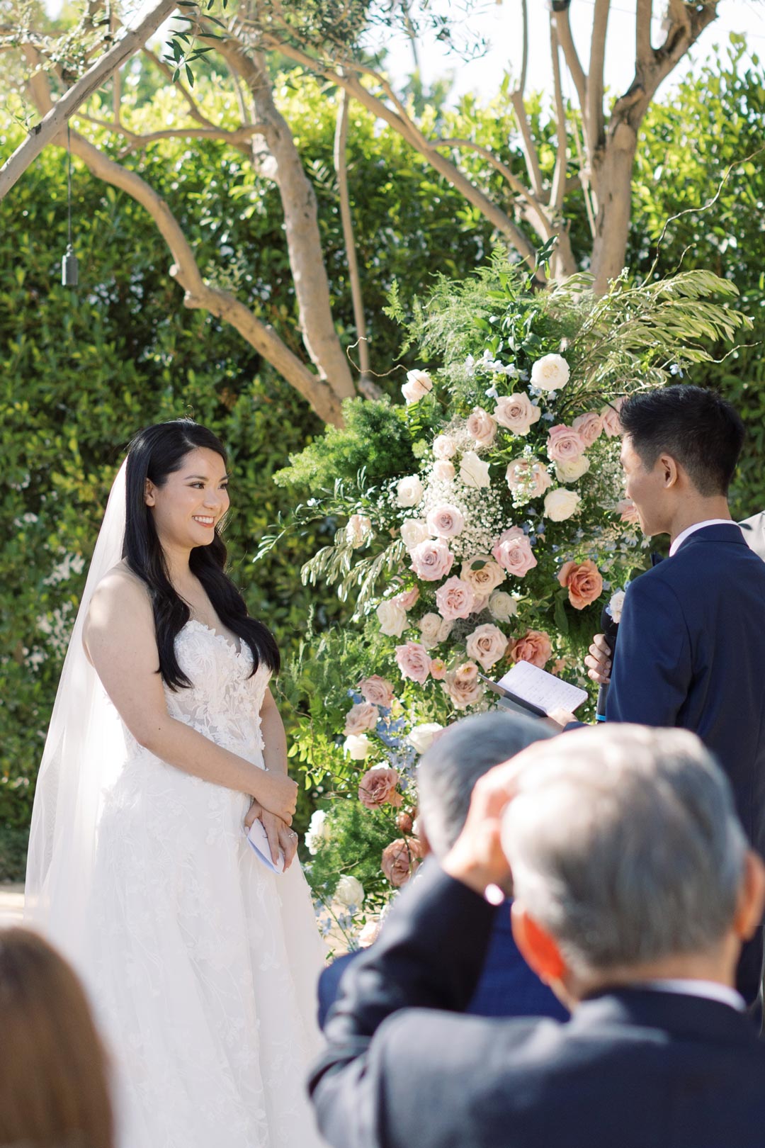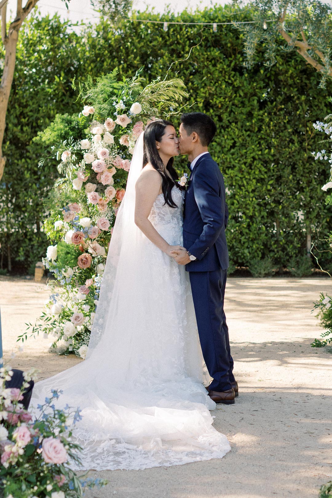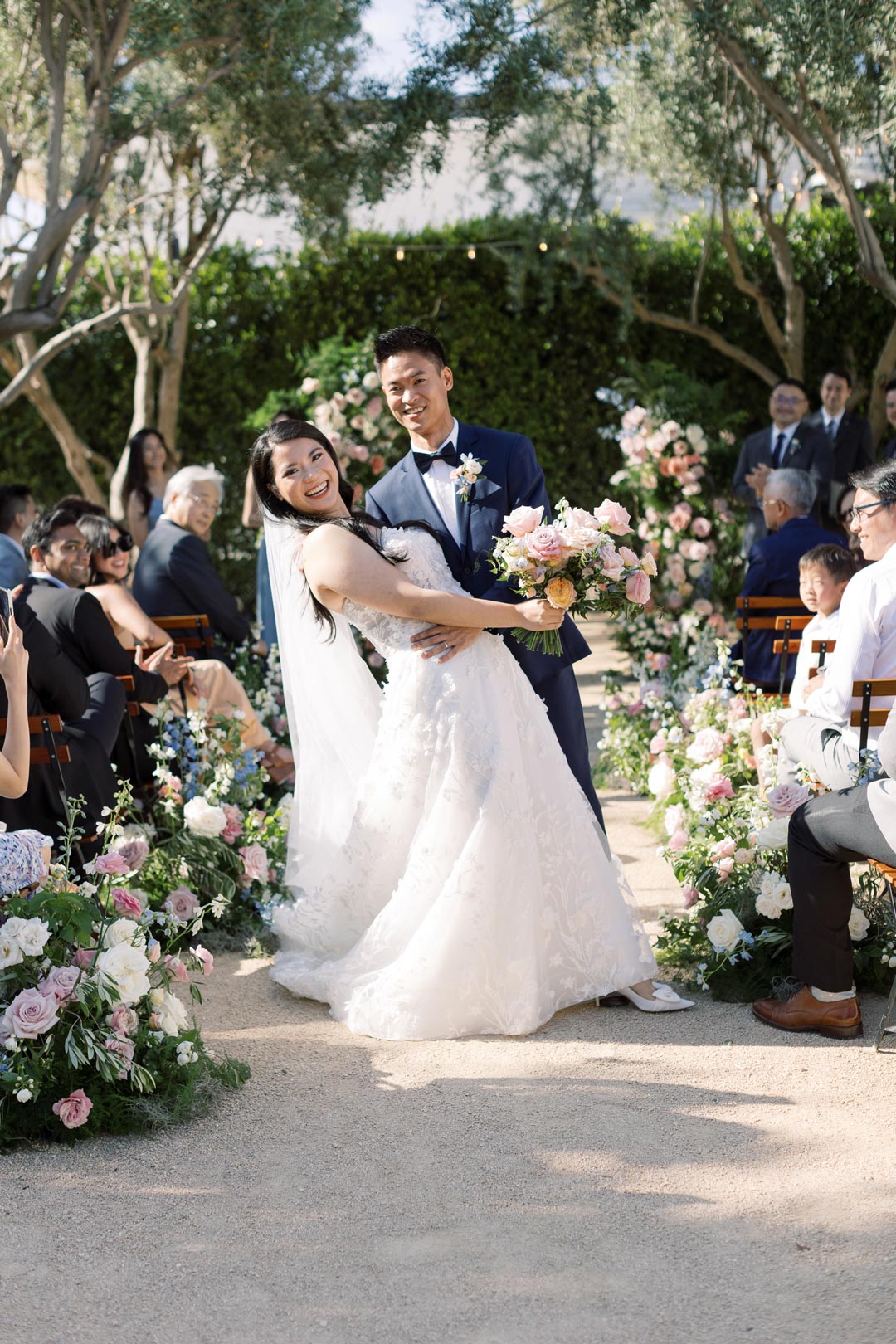 Guests entered the Olive Grove and found their seats on either side of the floral lined aisle. Pink, peach, white, and blue flower installs stood tall at the head of the aisle for the ceremony backdrop and music filled the air. Once everyone was in attendance, the wedding party made their entrances. Surrounded by loved ones, Sandy and Ted read personalized vows, exchanged rings, and sealed the ceremony with a kiss.