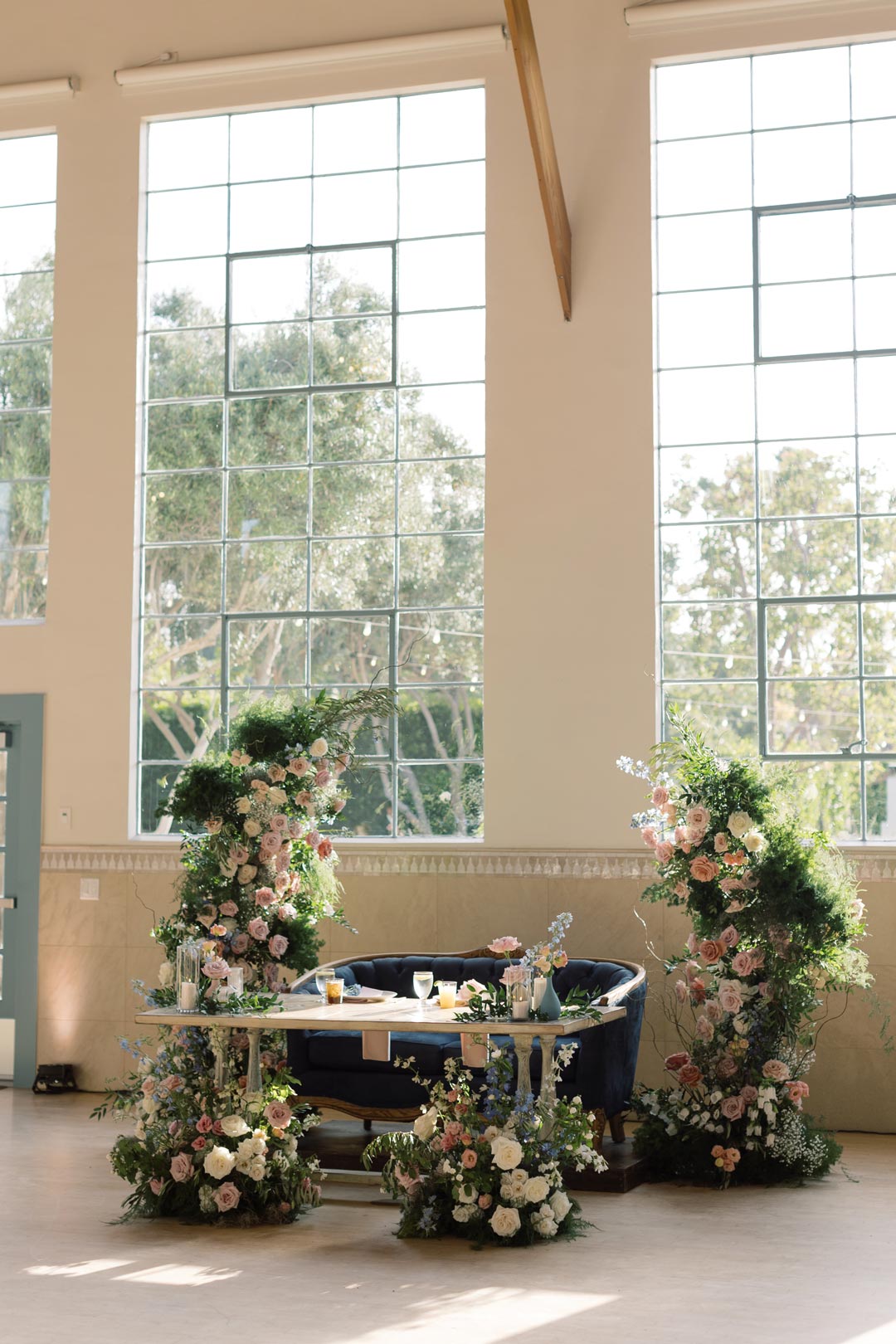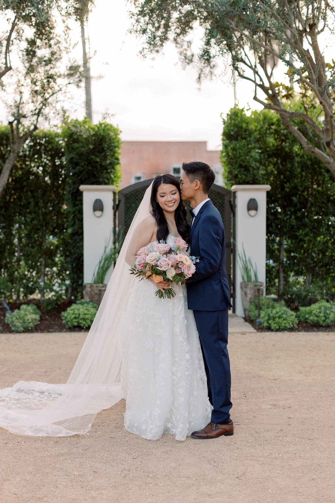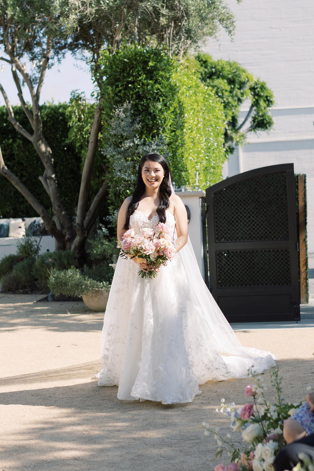 Guests entered the Olive Grove and found their seats on either side of the floral lined aisle. Pink, peach, white, and blue flower installs stood tall at the head of the aisle for the ceremony backdrop and music filled the air. Once everyone was in attendance, the wedding party made their entrances. Surrounded by loved ones, Sandy and Ted read personalized vows, exchanged rings, and sealed the ceremony with a kiss.