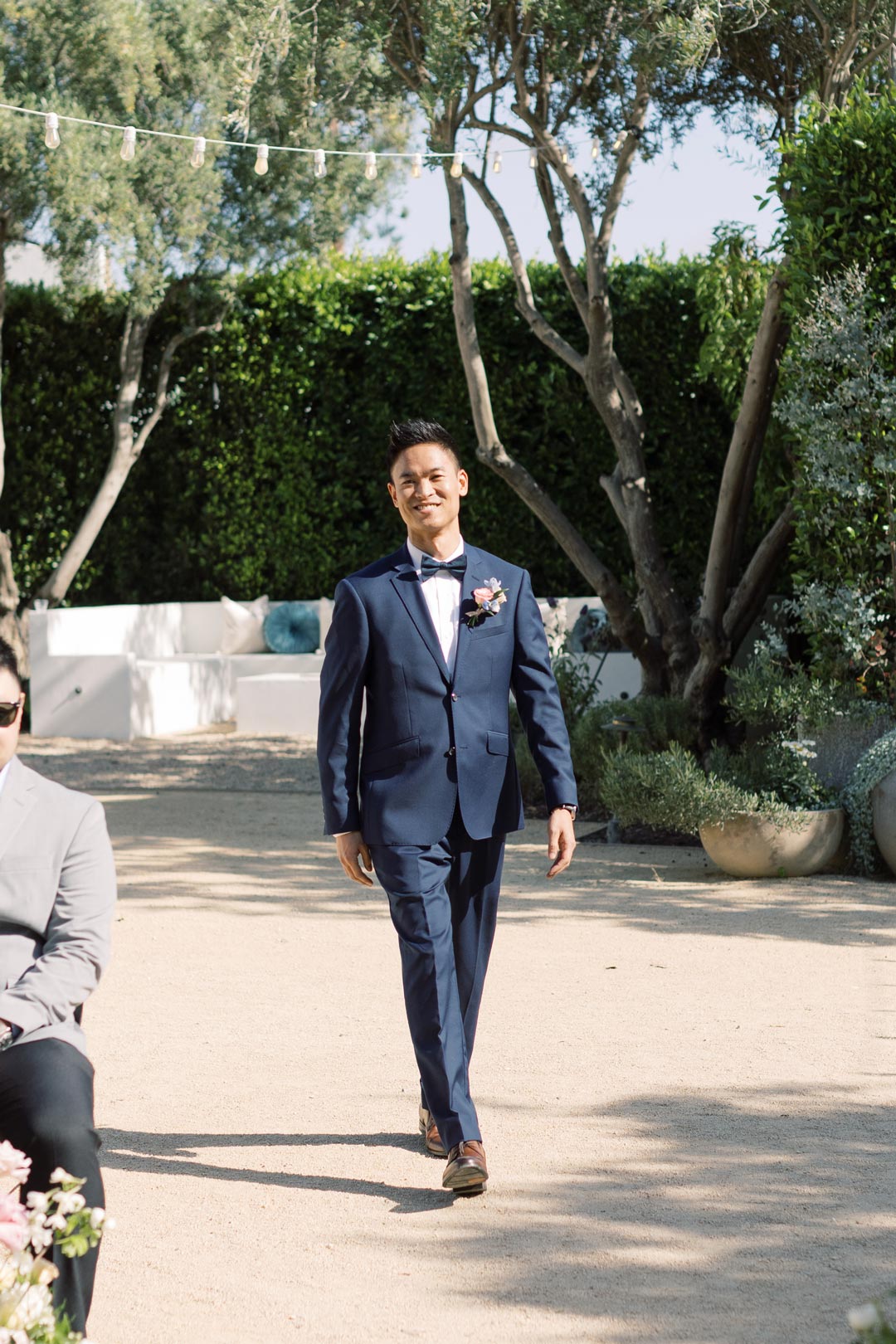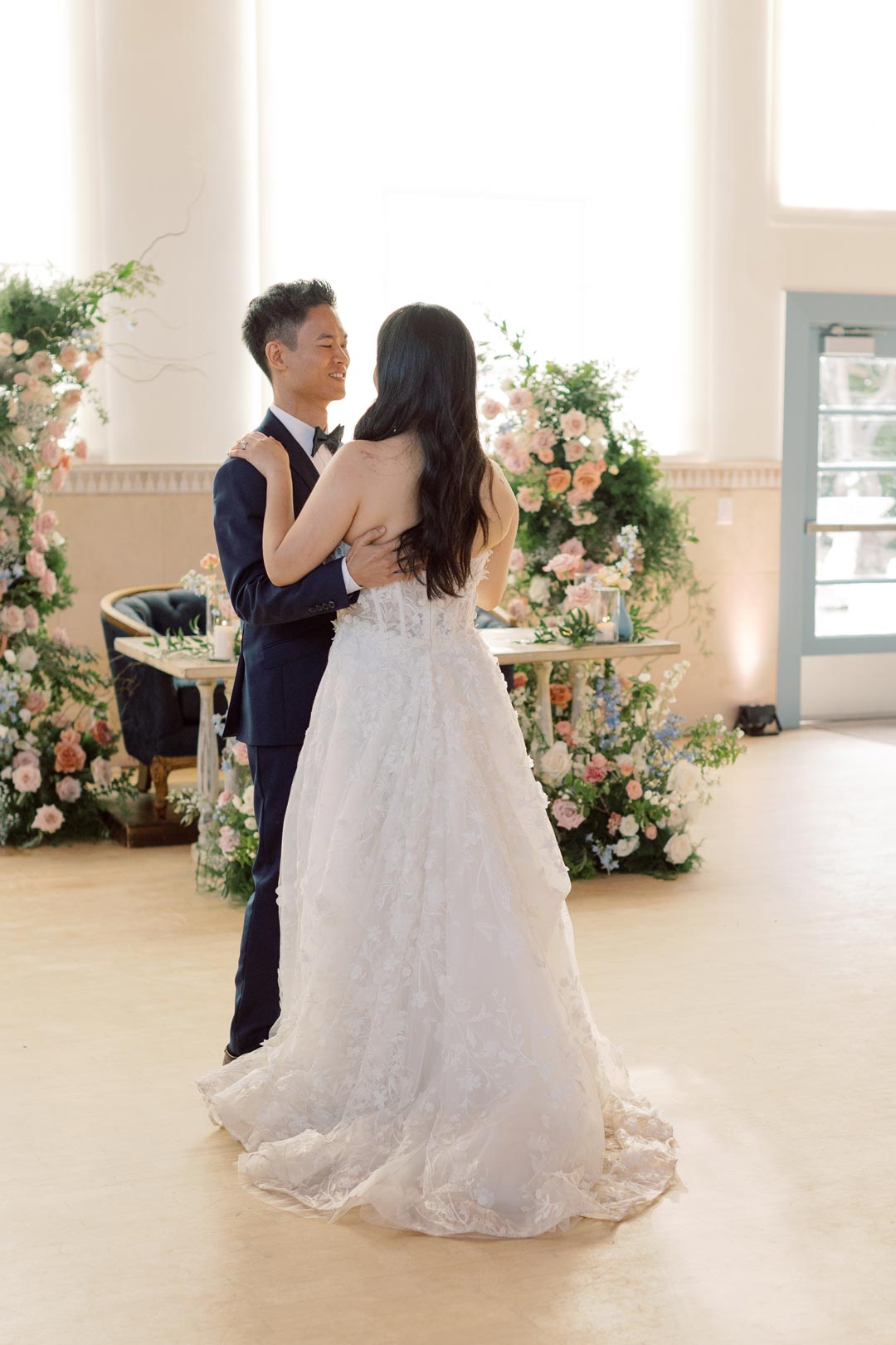 Sandy changed into her floral applique wedding gown and slipped into her white heels inside the Powder Room while Ted suited up across the Foyer in the Parlor. Once the bride and groom were ready, the couple met outside Grand Gimeno for their first look. On the count of three, Ted turned around to see his beautiful bride standing before him. The two shared sweet compliments and stood for some pictures together, then were joined by their bridesmaids and groomsmen. The group smiled for the camera, and once guests started to arrive, the wedding party lined up for ceremony.