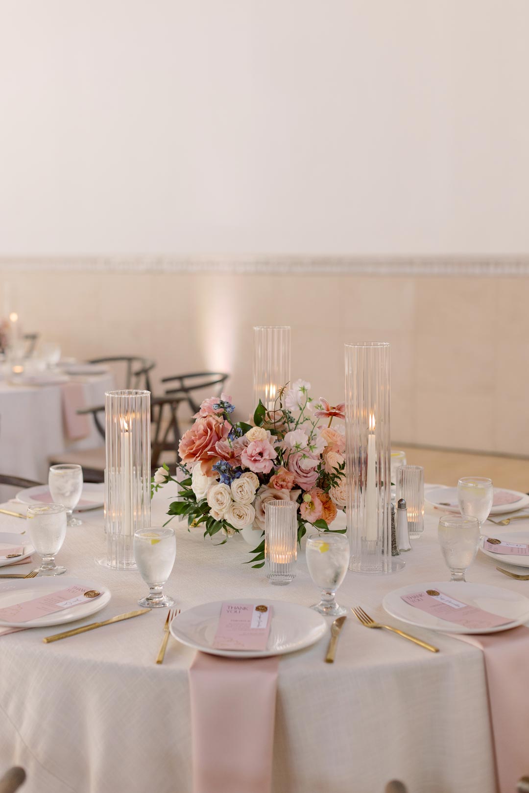 The smell of Wood-Fired Neapolitan Pizza and Classic Pepperoni Pizza filled the air as fresh slices were cut for guests to enjoy during cocktail hour. Along with the pizza, Sticky Pork Belly Bites, Fig, Goat Cheese and Mascarpone Tarts, and Filet and Wild Mushroom Wellingtons were tray passed and Vodka Pineapple and Whiskey Coke signature drinks were served. A blush and light blue lounge provided comfortable seating for guests near our fireplace and plenty of standing room was shared around cocktail tables. After plenty of mixing and mingling, it was time to head inside for reception.