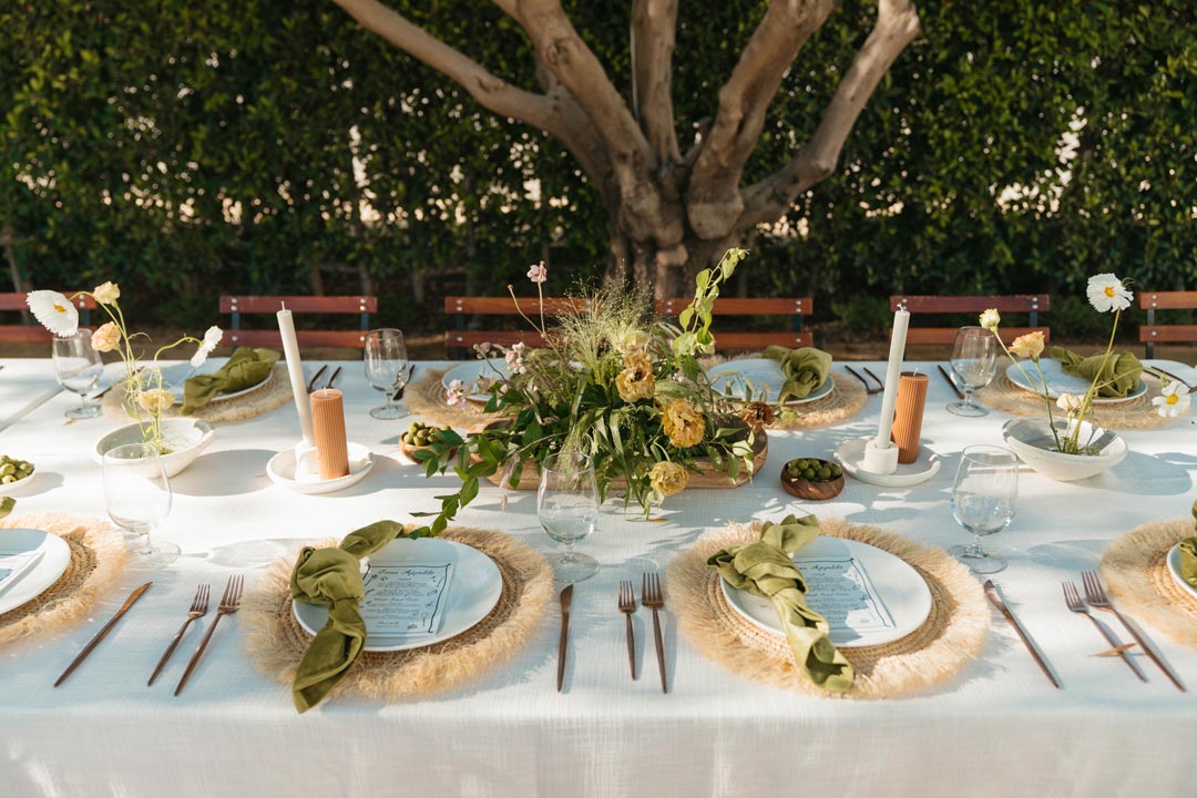 Inspired by the olive trees at Grand Gimeno, Tuscan inspired décor accented the venue for Jay’s Catering’s Sip & Spill event. Green patterned linens provided by BBJ La Tavola topped cocktail tables and matching velvet chartreuse napkins completed each place setting outside. Copper flatware was placed next to rattan chargers provided by Sundrop Vintage and our coupe plates topped with custom printed menus tied everything together. Fresh floral centerpieces artfully arranged by Sweet Floral Dreams, green olives, and candles made their mark down the long dinner table and a bar serving wine and Aperol Spritz cocktails was placed at the head.