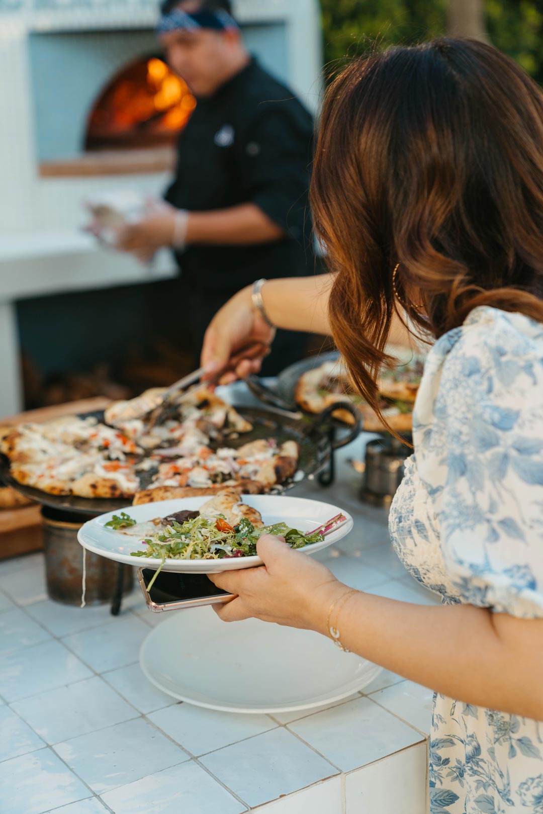 On the other side of the Foyer, bistro chairs were set in rows, and everyone found a seat. The Jay’s team presented to the attendees, and not long after, dinner was ready in the Olive Grove. Wood-Fired Neapolitan, Alfredo Bianca, and Steakhouse pizzas were being sliced fresh from the oven and Ensalada Las Mesas and Roasted Golden Beet Salad paired as sides. Guests grabbed their plates and headed over to the pizza bar where they filled their plates. Adam moved over to his mixer and DJ’ed the rest of the evening. Red and white wine was poured and Aperol Spritz cocktails were the event special. After mingling over the dinner table, everyone began to stand for group photos. While the photographer, Brian of Atlas & Rose Studios, was snapping away, Mango Yuzu Tarts were tray passed for dessert. As the sun went down, the crowd thinned. Goodbyes and hugs were shared, last bites of dessert were finished, and everyone made their exit.