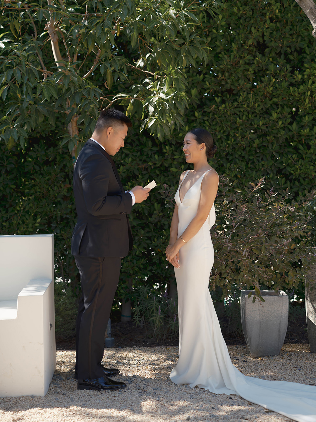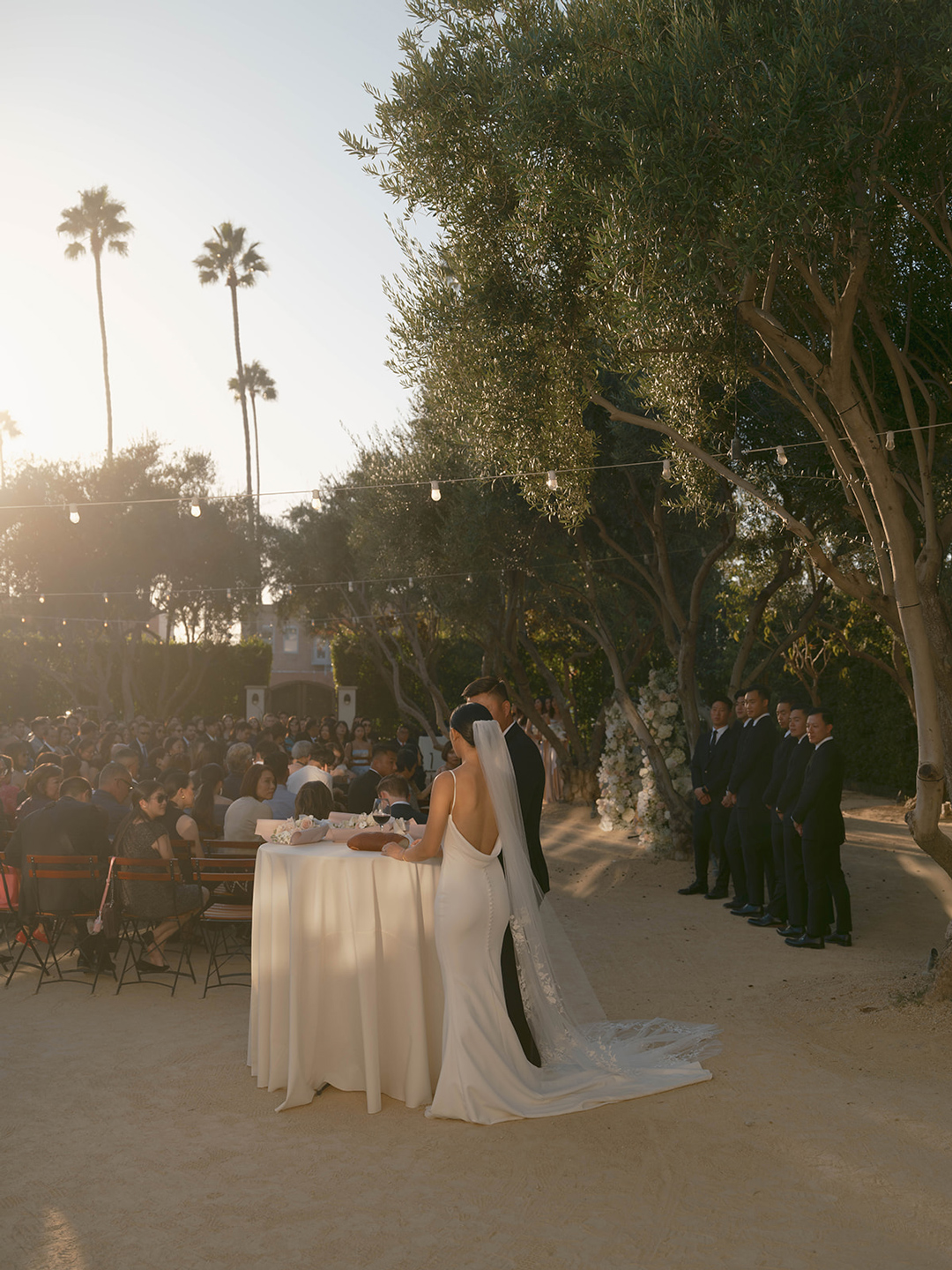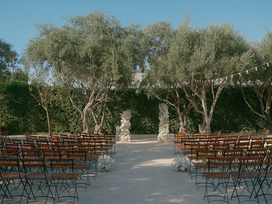 Danielle and Andrew’s closest loved ones each took turns sitting in front of the bride and groom as the tea ceremony was performed. Loving words were shared and tradition was upheld. At the end of the ceremony, guests had just started arriving and making their way back to the Olive Grove to take a seat for the wedding ceremony. White and light pink floral pillars marked the head of the aisle and matching arrangements were placed on both sides where chairs were lined up. Once everyone had taken a seat, the wedding party made their entrances ending with Danielle. In front of their closest friends and family, the bride and groom recited vows, broke bread, exchanged rings, and sealed the ceremony with a kiss.
