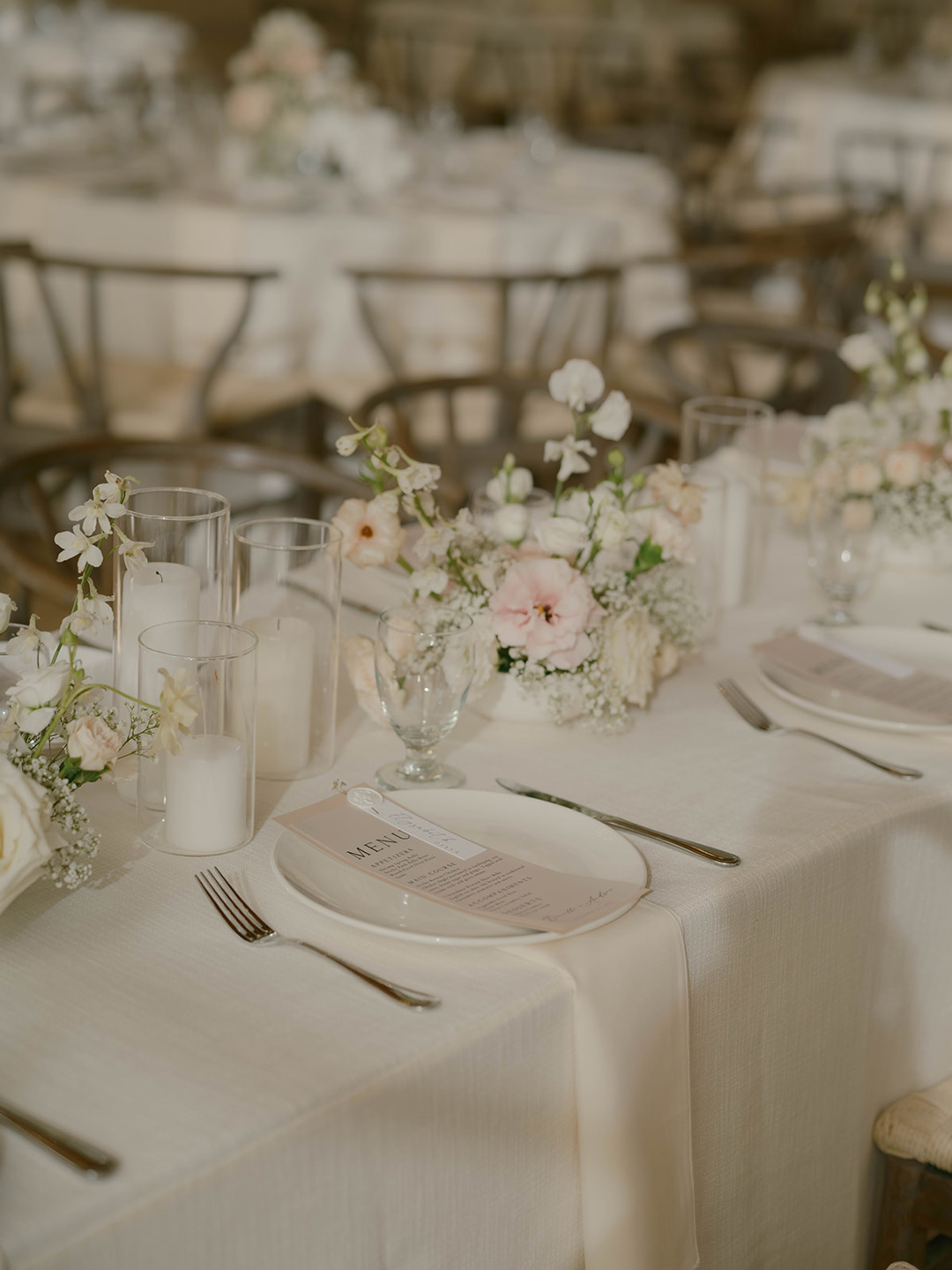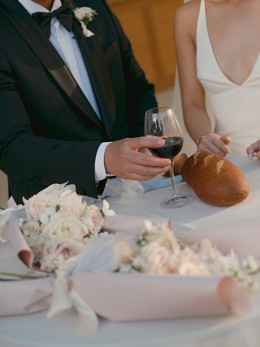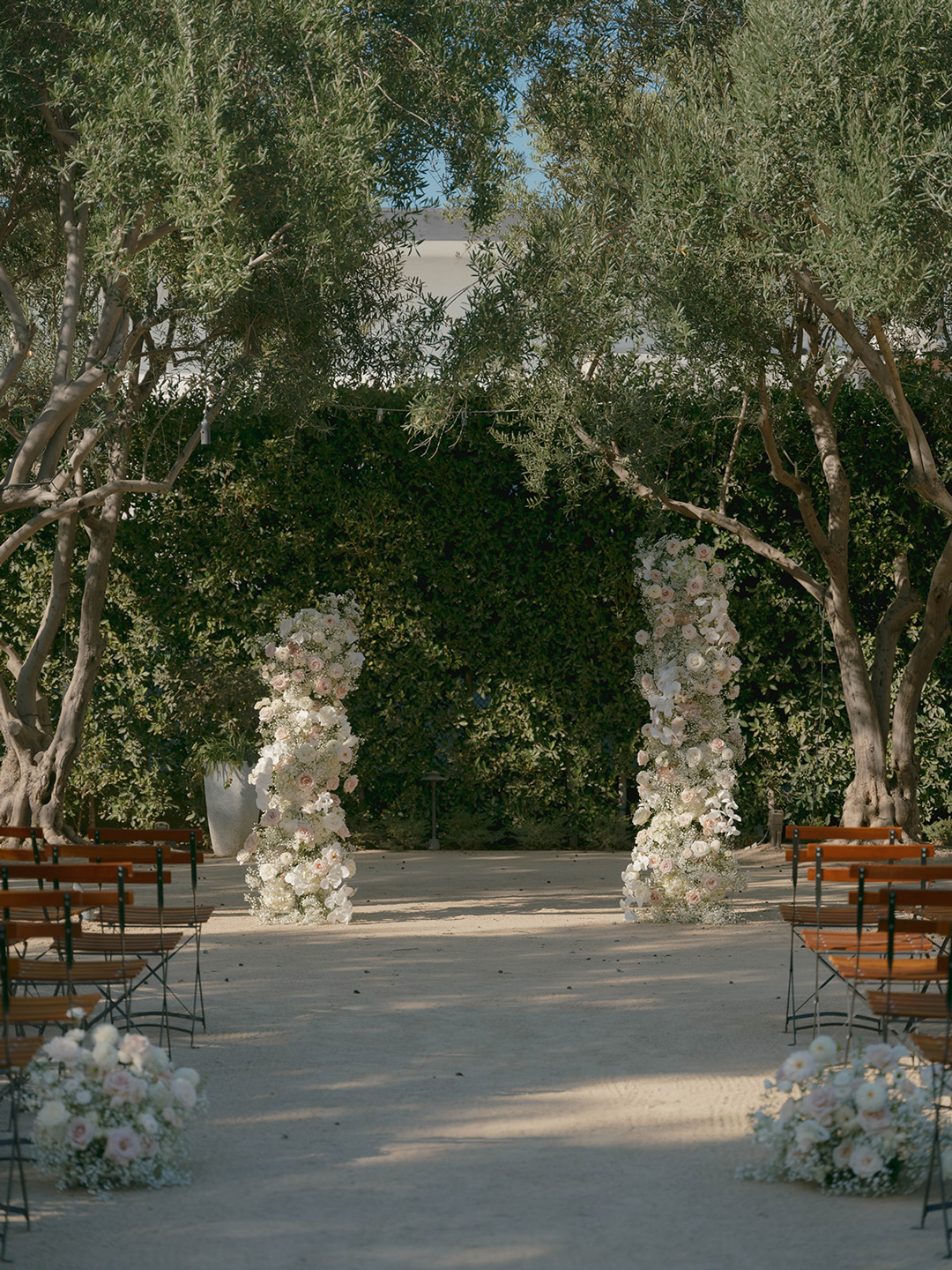 Danielle and Andrew’s closest loved ones each took turns sitting in front of the bride and groom as the tea ceremony was performed. Loving words were shared and tradition was upheld. At the end of the ceremony, guests had just started arriving and making their way back to the Olive Grove to take a seat for the wedding ceremony. White and light pink floral pillars marked the head of the aisle and matching arrangements were placed on both sides where chairs were lined up. Once everyone had taken a seat, the wedding party made their entrances ending with Danielle. In front of their closest friends and family, the bride and groom recited vows, broke bread, exchanged rings, and sealed the ceremony with a kiss.