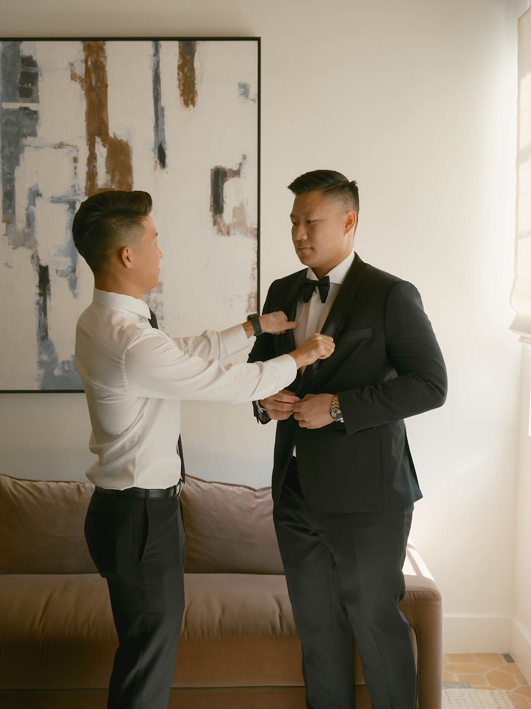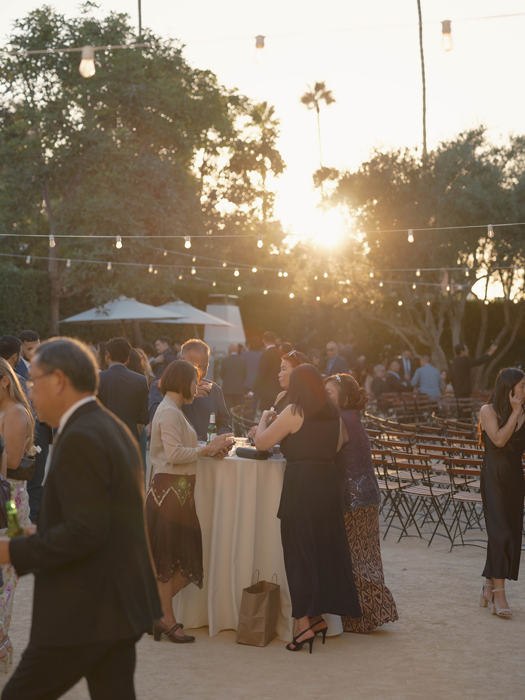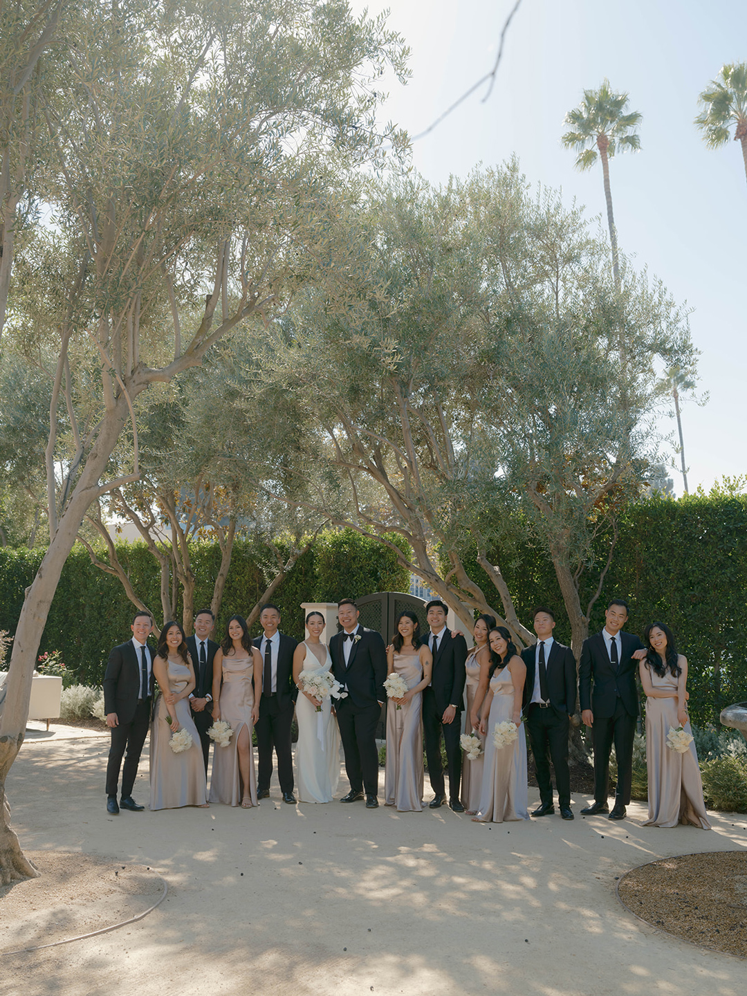 Danielle and her bridesmaids and Andrew and his groomsmen got ready inside the Parlor and Powder Room at Grand Gimeno anxiously awaiting the big day ahead. Suited up and bowtie fastened, Andrew headed out to the Olive Grove for his first look with. Danielle. Shortly after, he could hear steps approaching from behind. A tap on the shoulder turned him around to see his beautiful bride standing before him in a white dress with low back and button detail. The couple shared a warm embrace and read personalized vows, then joined their wedding party for group pictures. In the shade of nearby olive trees, the group posed for the camera, the guys in black and girls in blush. After, they all headed into the Foyer for the tea ceremony.