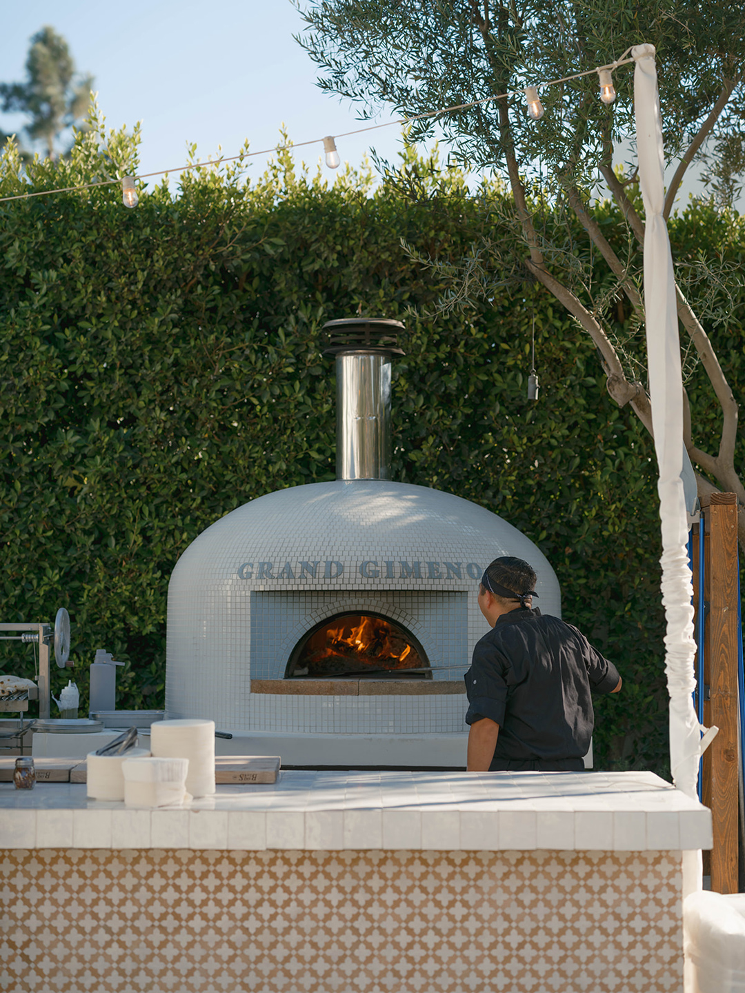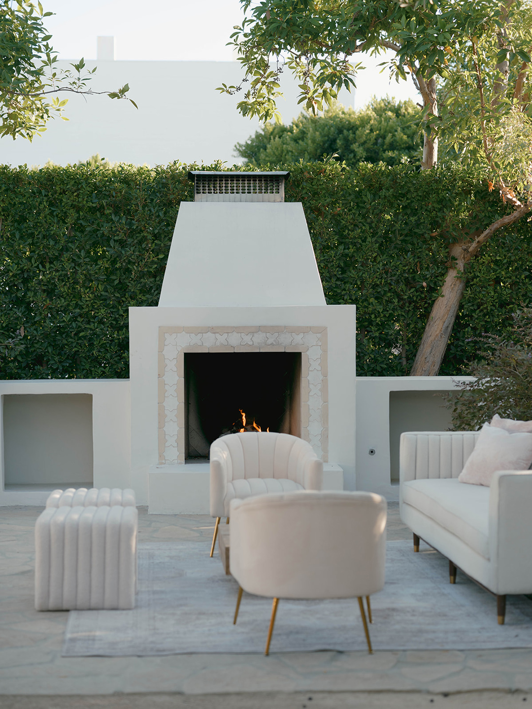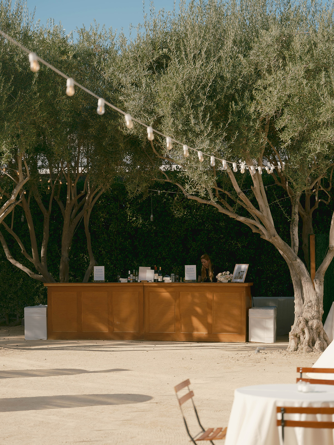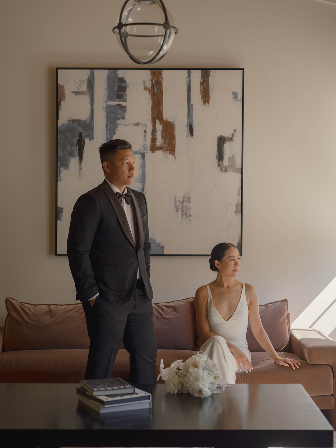 Danielle and her bridesmaids and Andrew and his groomsmen got ready inside the Parlor and Powder Room at Grand Gimeno anxiously awaiting the big day ahead. Suited up and bowtie fastened, Andrew headed out to the Olive Grove for his first look with. Danielle. Shortly after, he could hear steps approaching from behind. A tap on the shoulder turned him around to see his beautiful bride standing before him in a white dress with low back and button detail. The couple shared a warm embrace and read personalized vows, then joined their wedding party for group pictures. In the shade of nearby olive trees, the group posed for the camera, the guys in black and girls in blush. After, they all headed into the Foyer for the tea ceremony.