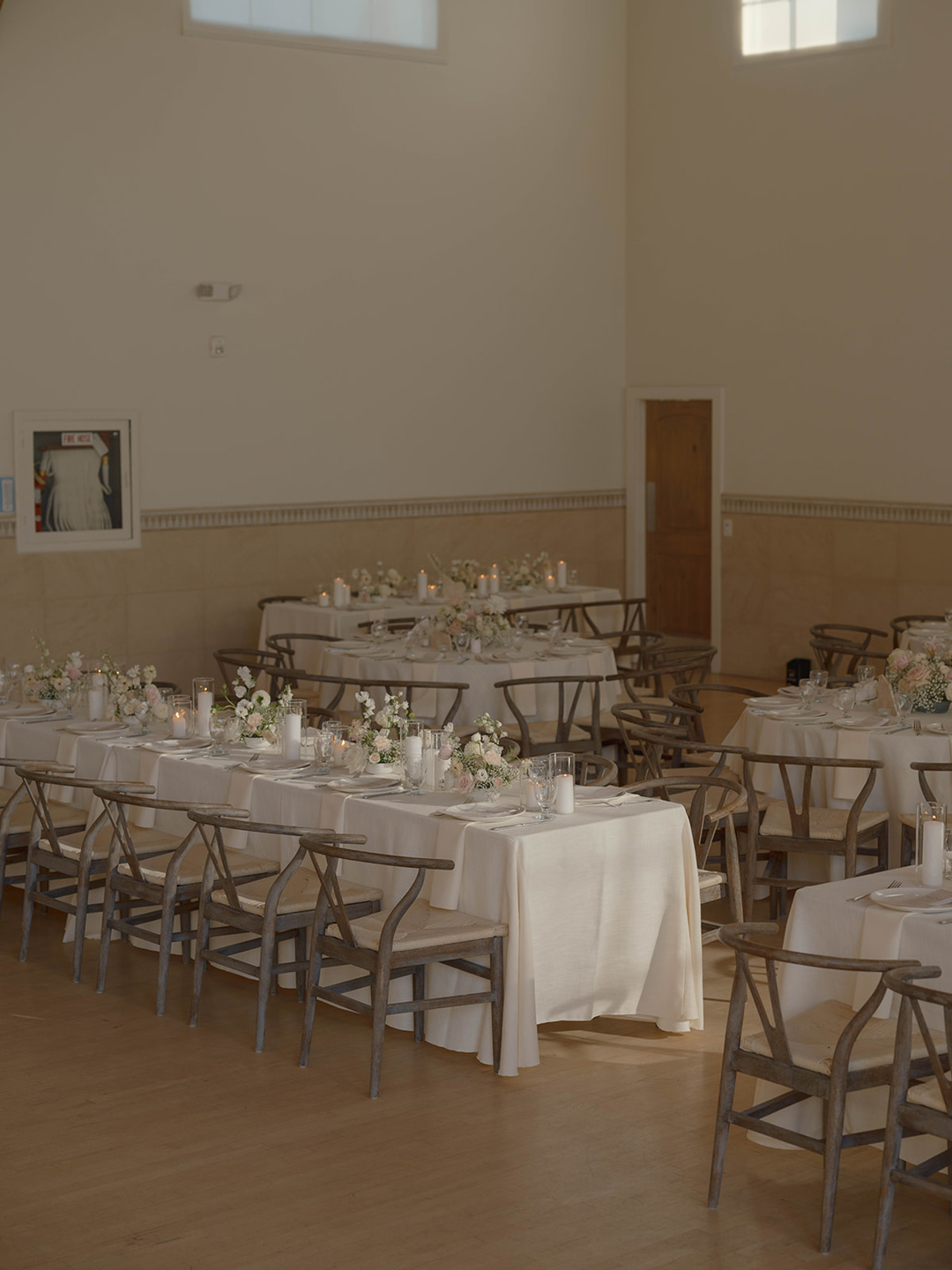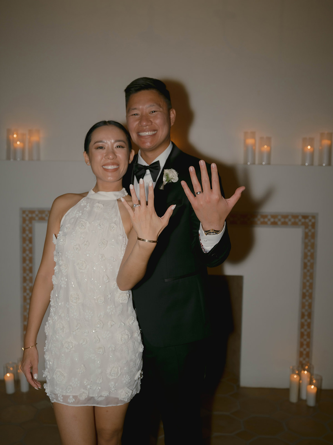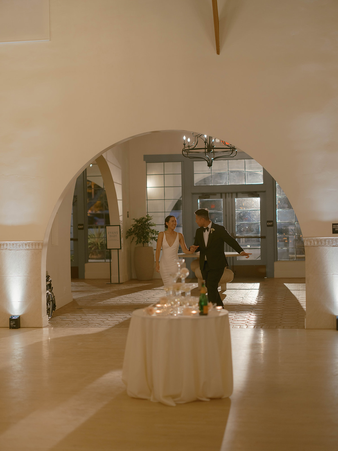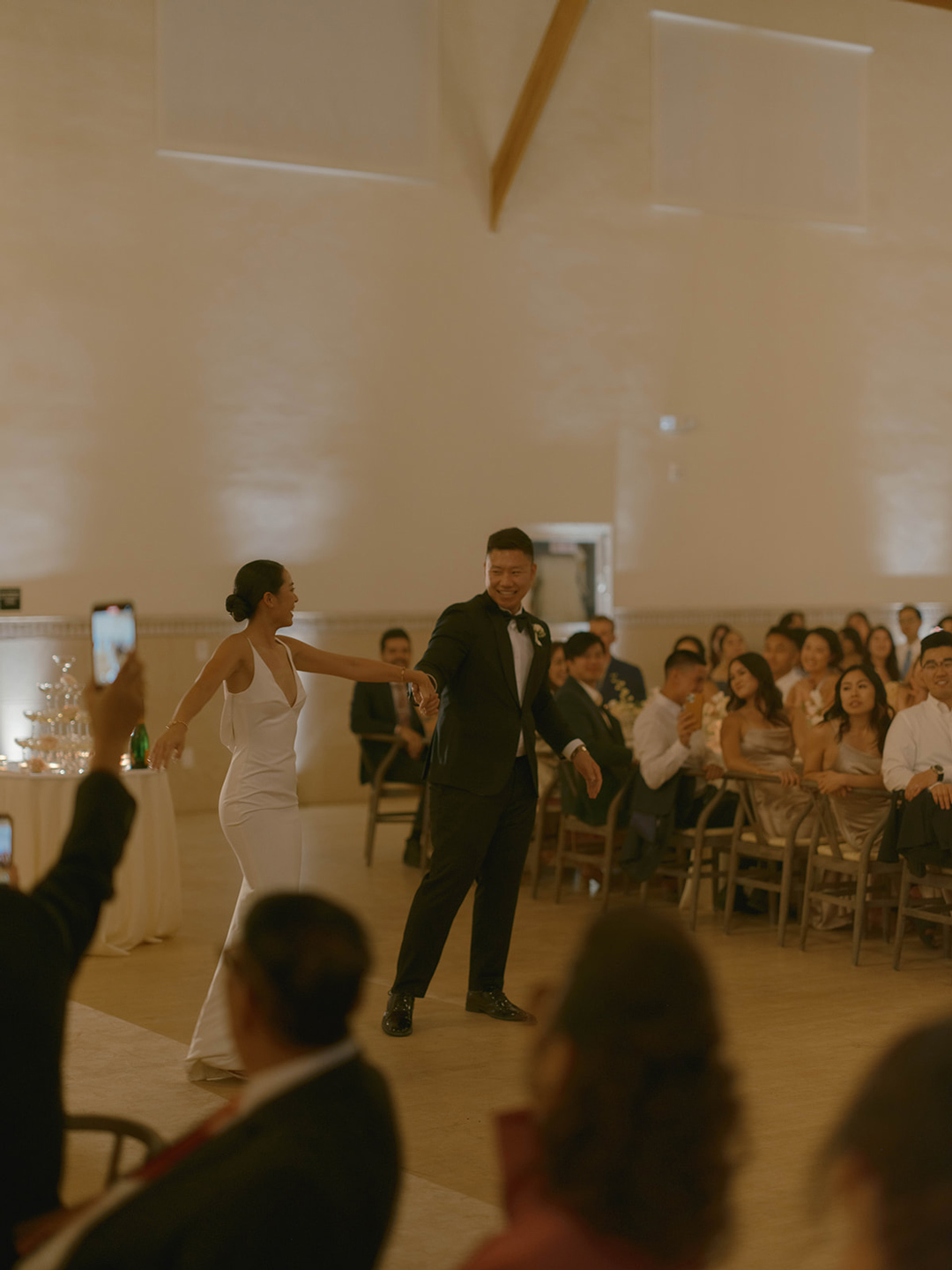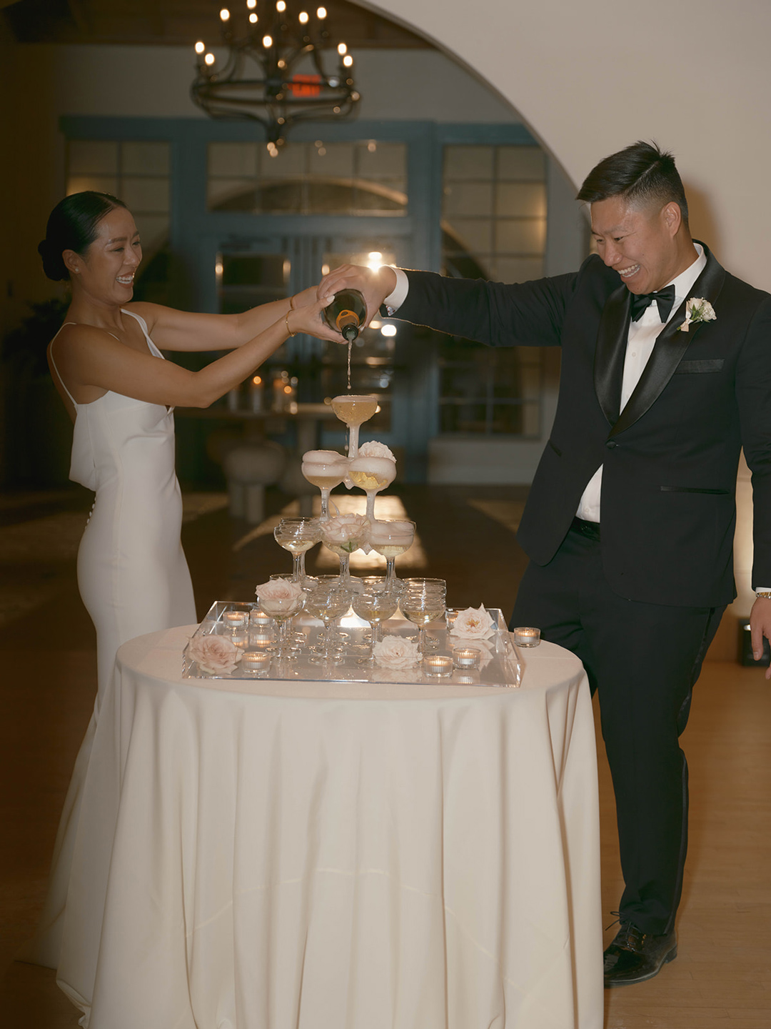 Inside, tables were topped with fresh floral centerpieces and white candles flickered creating a romantic ambiance. Guests checked the seating chart and found their assigned seats. Andrew and Danielle made their grand entrance, shared their first dance, and poured champagne toasting with friends. Gochujang Chicken and Vietnamese Braised Short Ribs with Pineapple Fried Rice, Chow Mein, and Cucumber Salad was served once everyone was seated. The dinner menu was selected by the bride and groom with help from our event specialist, Selena. Family and friends stood to share toasts and the dinner came to an end. Glasses clinked in the air and the newlyweds invited everyone to the dance floor. The remainder of the evening was spent showing off dance moves and wishing the newlyweds well.